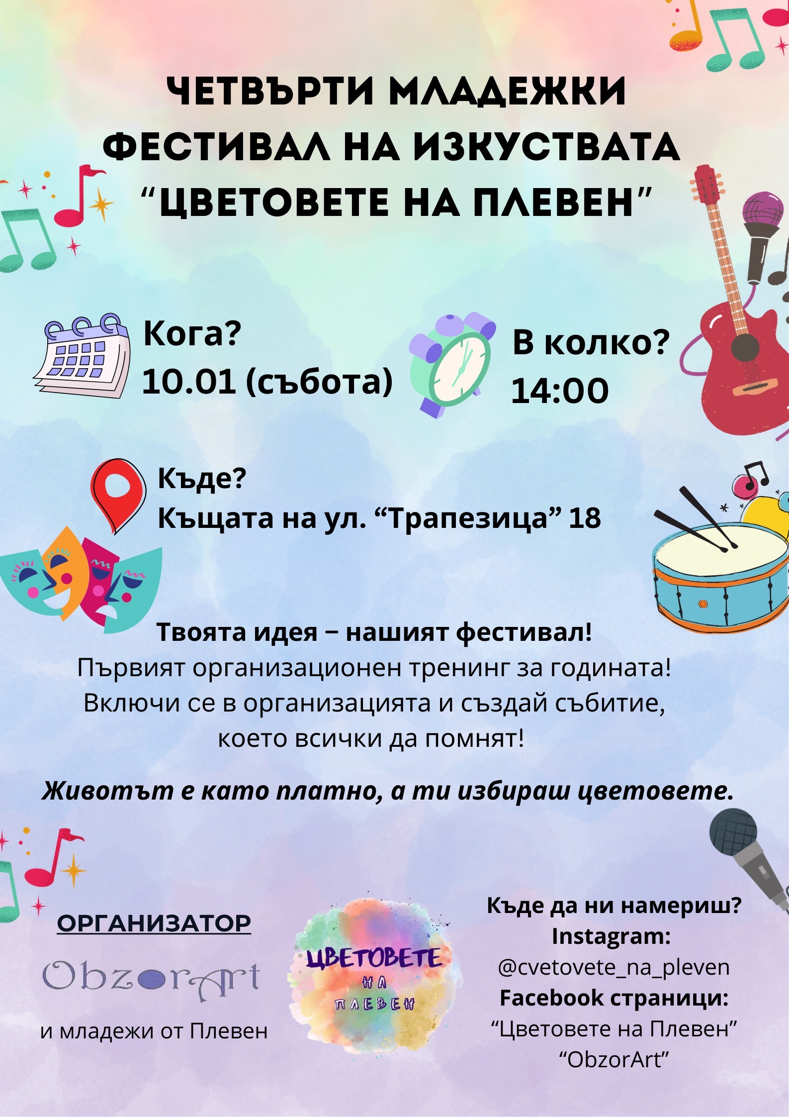 Каним ви да се включите в първата организационна среща за годината, посветена на подготовката на четвъртото издание на Младежкия фестивал на изкуствата „Цветовете на Плевен“.